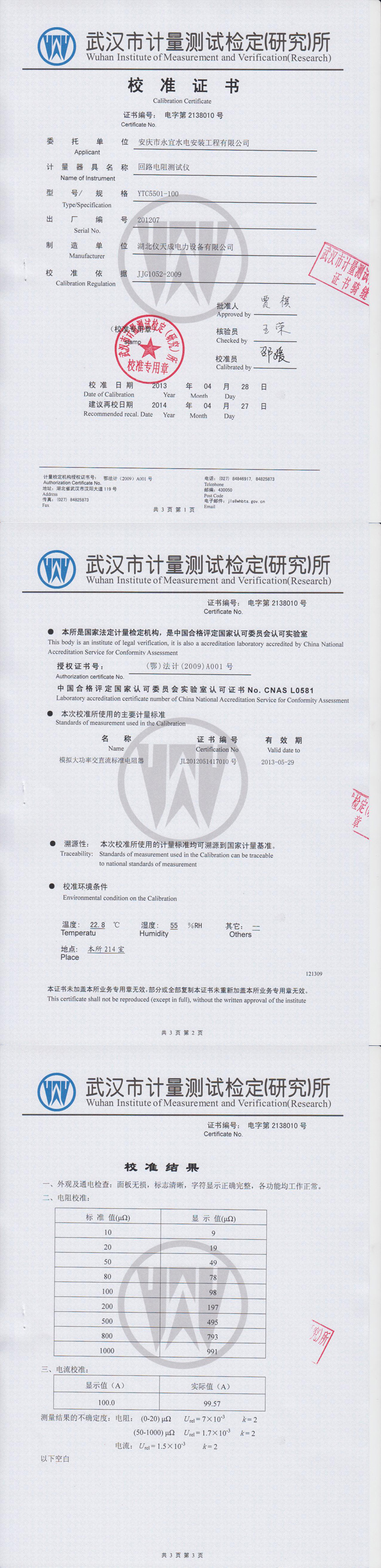 YTC5501-100回路電阻測試儀資質(zhì)證書