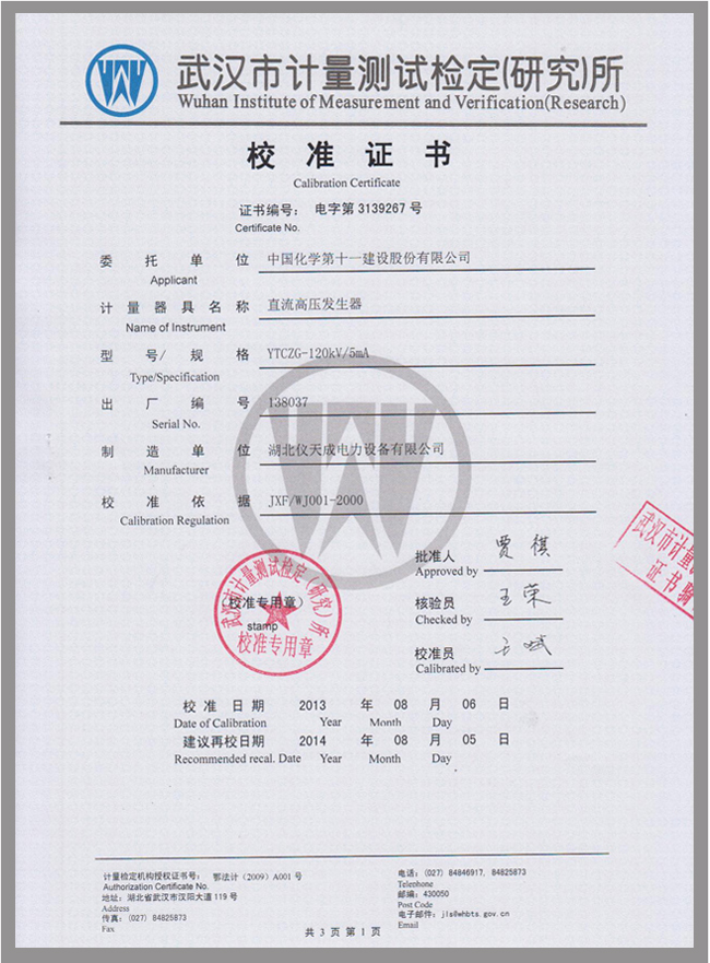 轉載:"YTCZG-120kV/2mA直流高壓發(fā)生器鑒定證書" 請注明來源于儀天成電力。 更多技術問題請致電儀天成電力客戶服務:027-87876585,技術部專線:027-87876585,在線客服:719388481