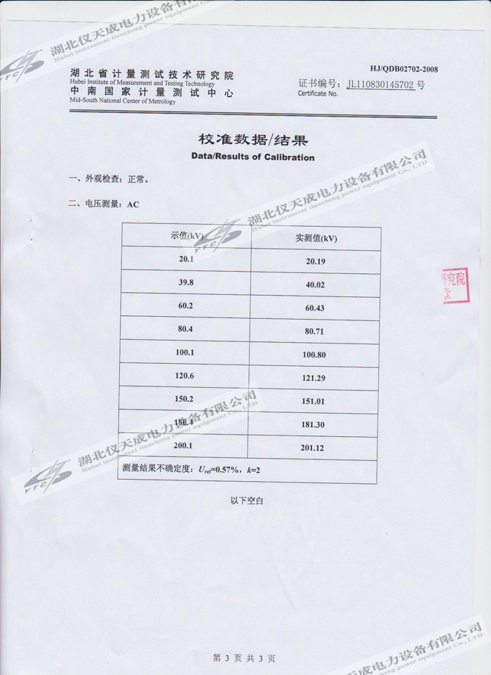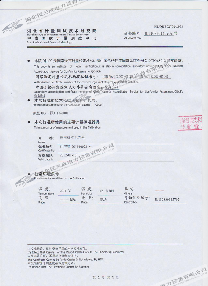 轉載:"YTC850-810kVA/270kV/45kV變頻串聯(lián)諧振試驗裝置的資質證書" 請注明來源于儀天成電力。 更多技術問題請致電儀天成電力客戶服務:027-87876585,技術部專線:027-87876585,在線客服:719388481